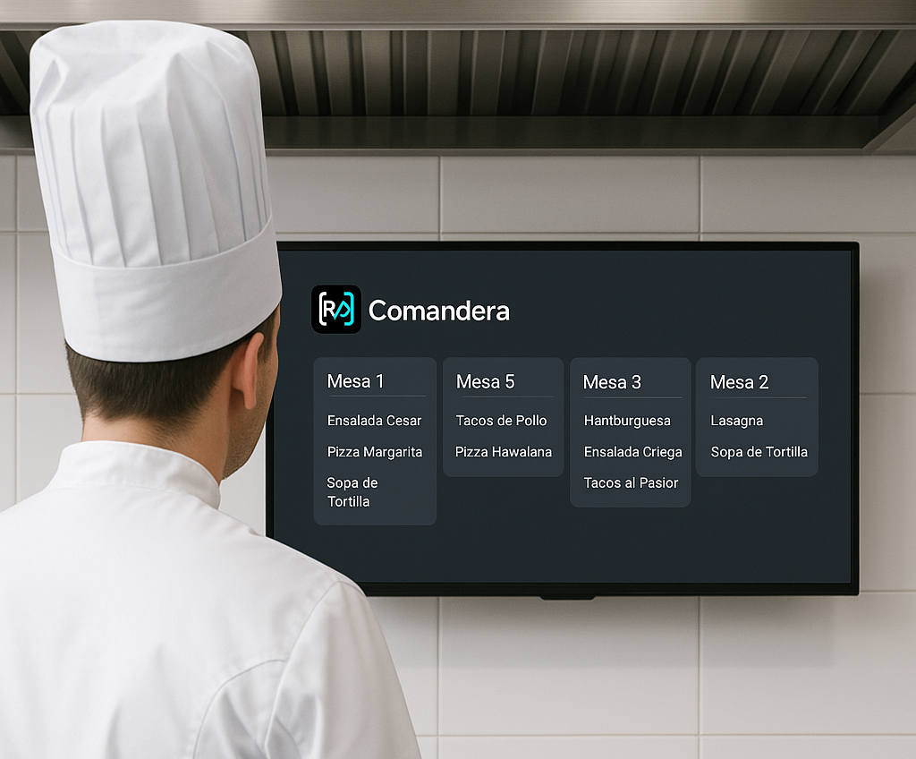 Sistema de visualización de comandas en cocina, con una interfaz clara para facilitar la preparación de los pedidos. Compatible con pantallas o dispositivos táctiles.